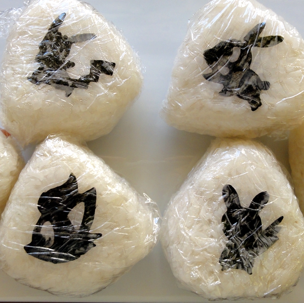 Unmold the rice balls and place a punched out sheet of Pokemon nori in the middle for decoration. Re-wrap the rice balls with a new piece of plastic wrap to keep them fresh and portable.