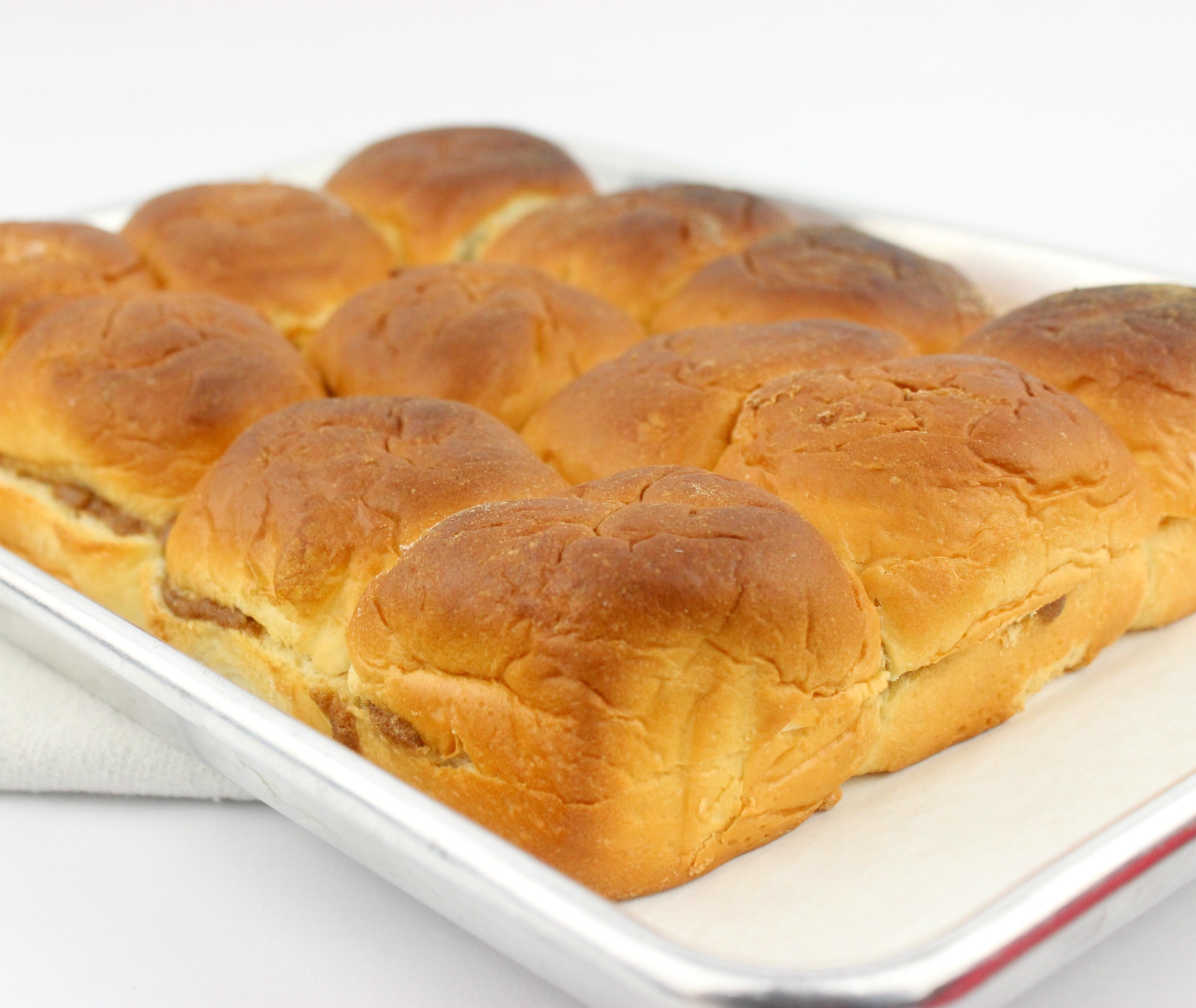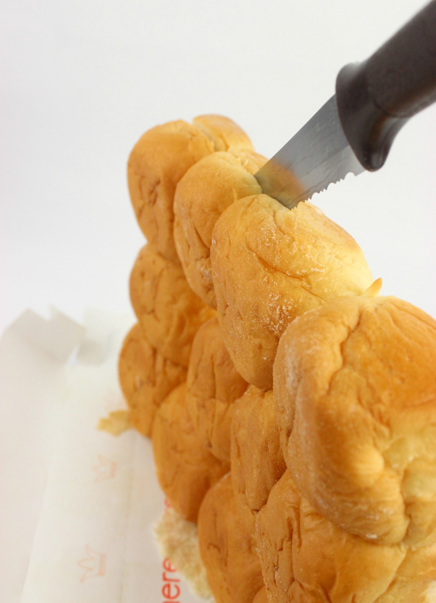 The secret to my quick hack is using my favorite King’s Hawaiian sweet bread rolls. I always have them in the house because they’re good for so many uses, savory or sweet. Now realistically, you could make these individually but we all know you’ll be going back for more so you might as well use the whole bag.