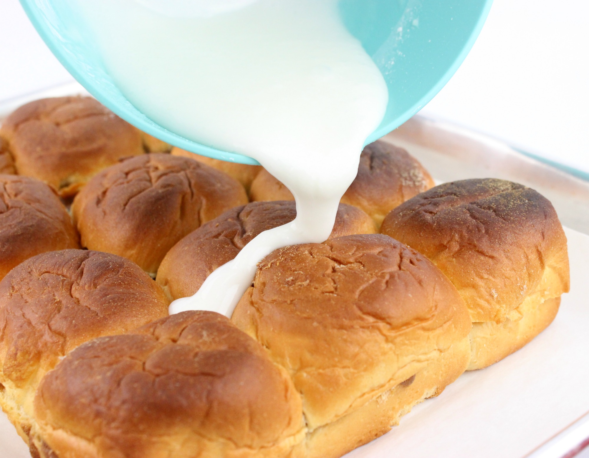 Step 5: In a bowl whisk together the powdered sugar, lemon juice, and milk. Drizzle over the hot rolls. Serve immediately.