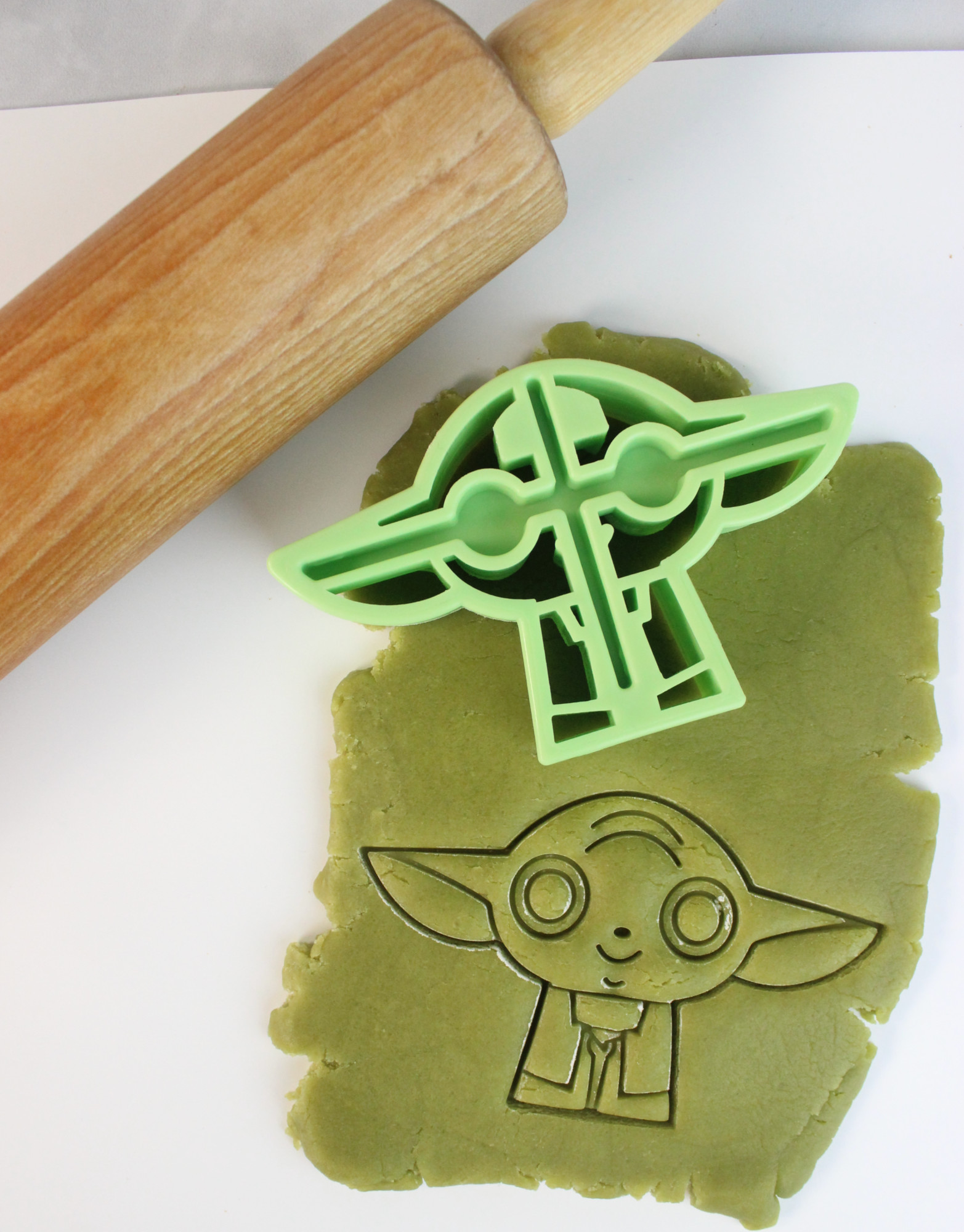 Step 11: Roll out the green dough to about 1/4 inch thick. Flour the cookie cutter and cut out Grogu’s head, then transfer onto the prepped baking sheets.