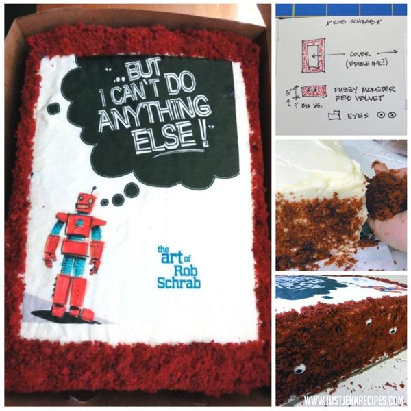 Image Comics asked me to make a cake for the Rob Schrab book release party held at Meltdown Comics in Hollywood. My design concept was to make a massive cake that looked like a fuzzy monster, complete with peeking eyeballs along the side and the actual book cover on top. Scary, cute, and of course, delicious. A cute but disturbing cake perfect for a monster party!