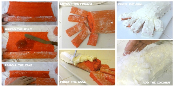 Frost the cake arm and fingers with the whipped cream cheese frosting.
