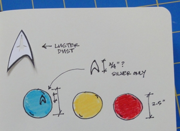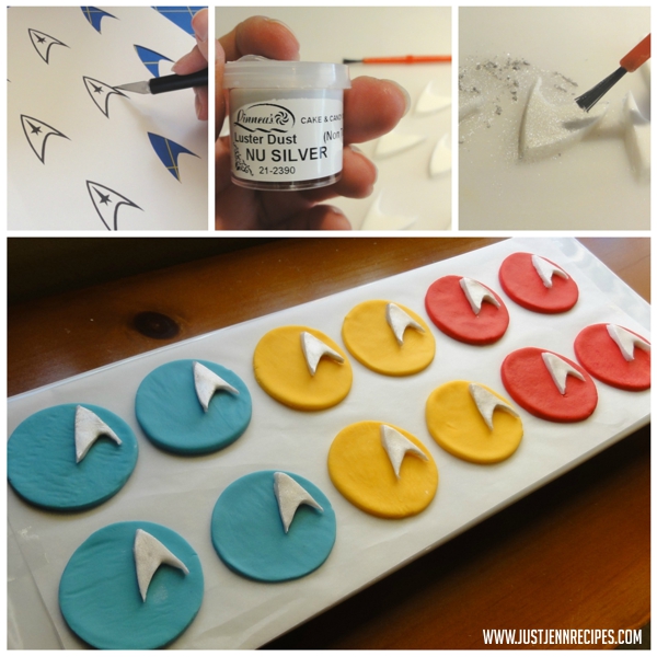 Print out 1″ tall communicator insignias and use that as a template to cut out pieces of white fondant.