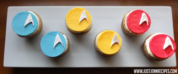 I love Star Trek ToS, the original series. The uniform colors and the sleek faux modern look are so very futuristic. Simple and colorful translates easiy into cupcakes so I sketched up some ideas and gave it a go.