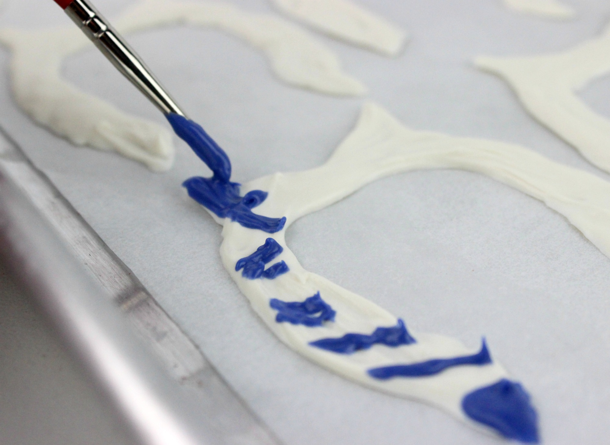 Once the white chocolate has set, place the blue candy melts in a heat-safe bowl and microwave at 15-20 second intervals until melted. Use a small kitchen paintbrush to add the blue details. While the chocolate is setting, start the cookies.