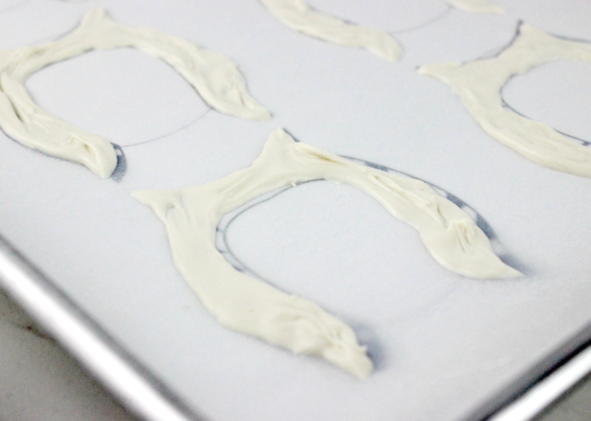 Place the white candy melts in a heat-safe bowl and microwave at 15-20 second intervals until melted. Use a small spoon or clean kitchen paintbrush to form the base of the montrals. Let set.