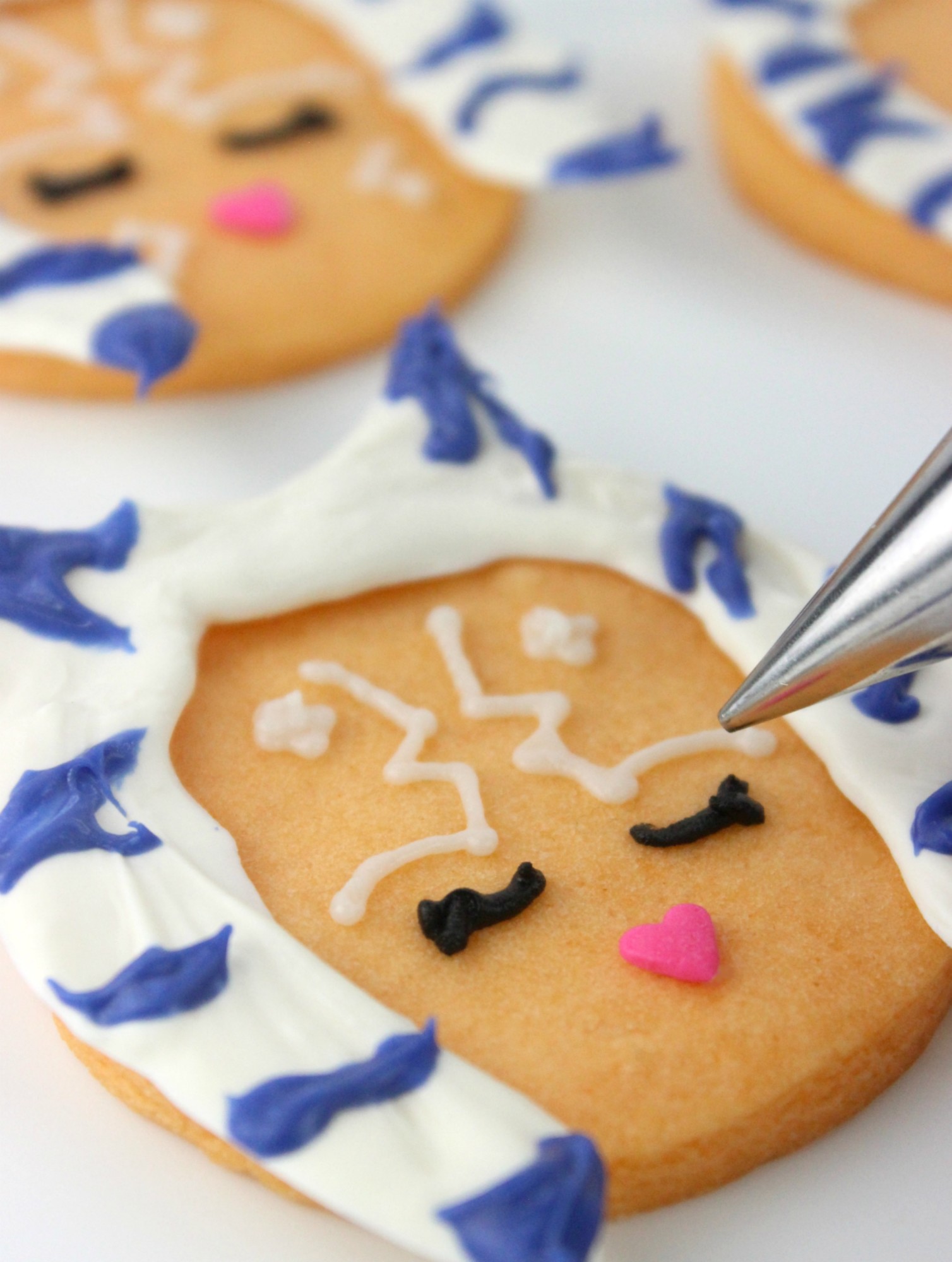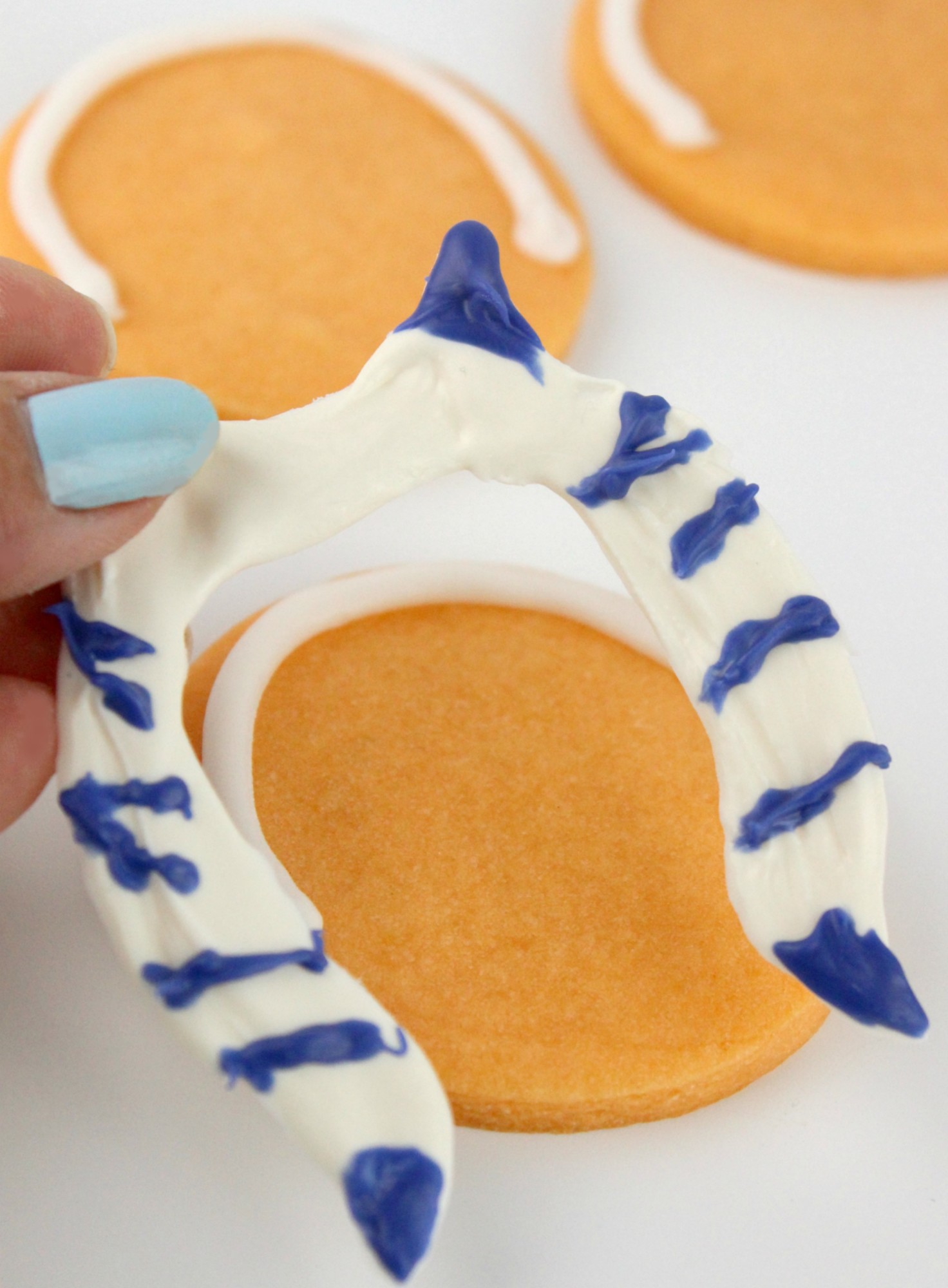 Once the cookies are cool, use the white icing to secure the headpiece onto the top of the cookie.