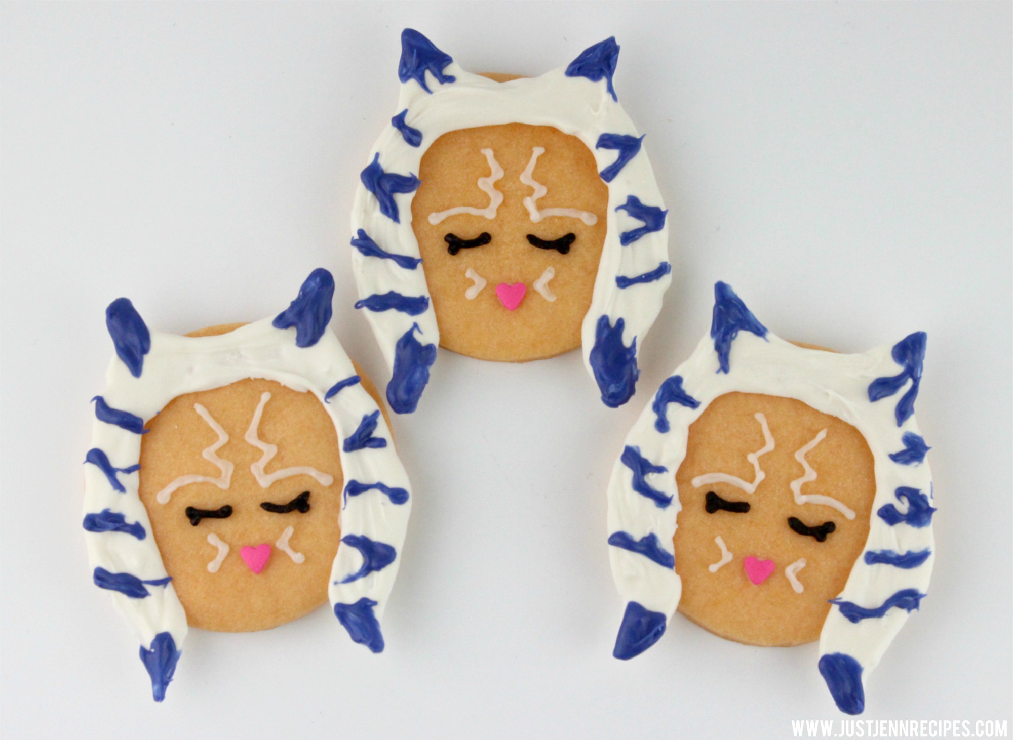 These Ahsoka Tano cookies are a sweet, simple tribute to the Padawan of Anakin Skywalker and the hero of the Clone Wars. The cookie base reflects her Togruta skintone, and it’s topped off with hand painted chocolate montrals to form the top of the head.