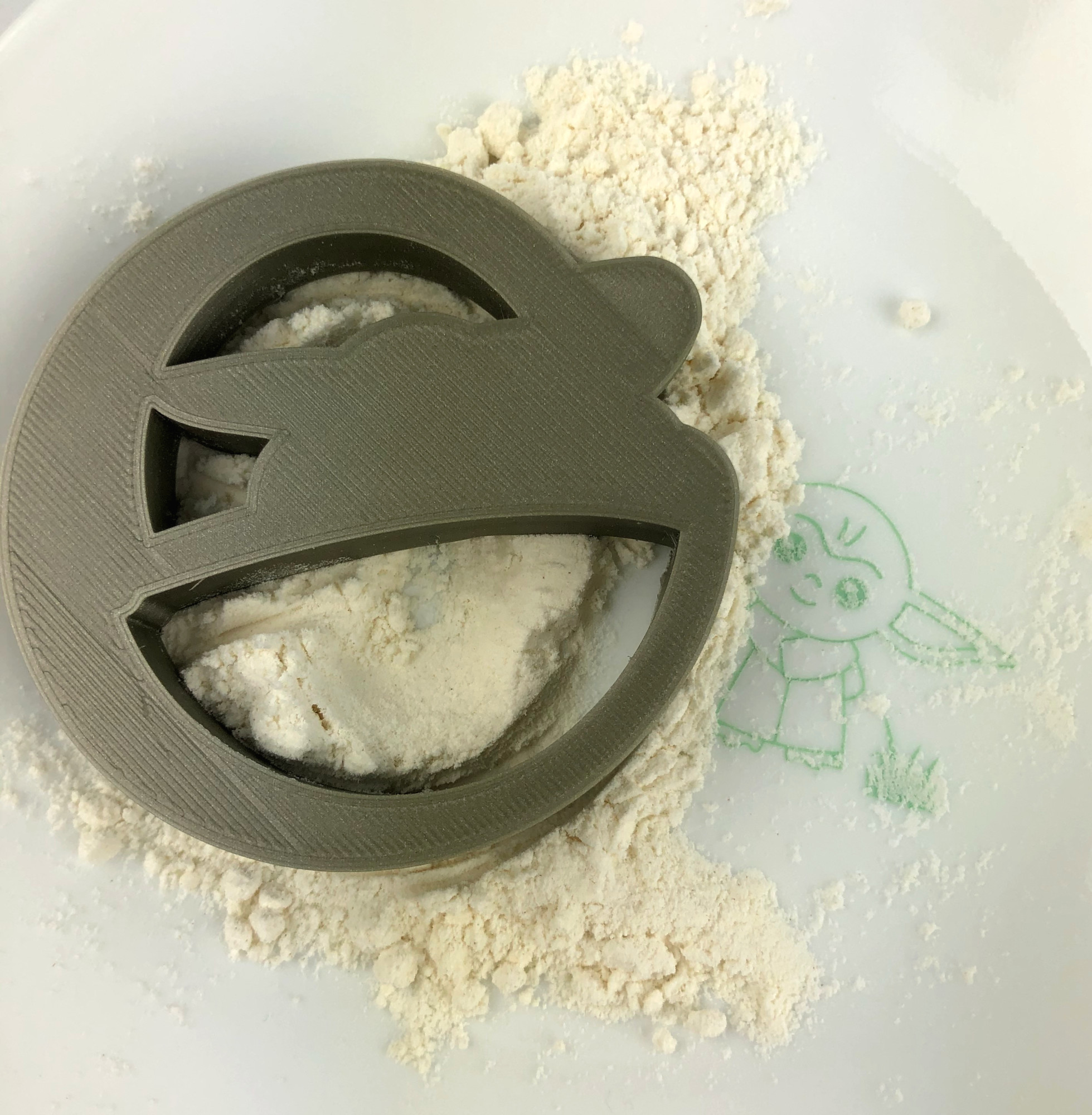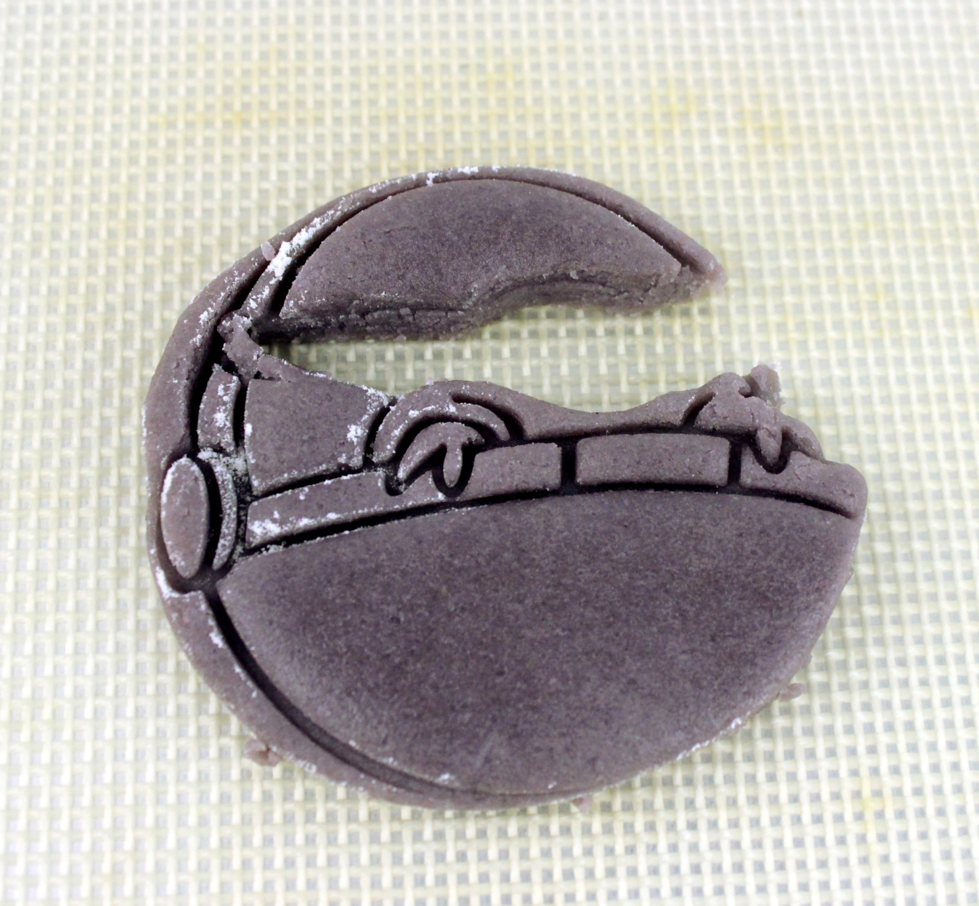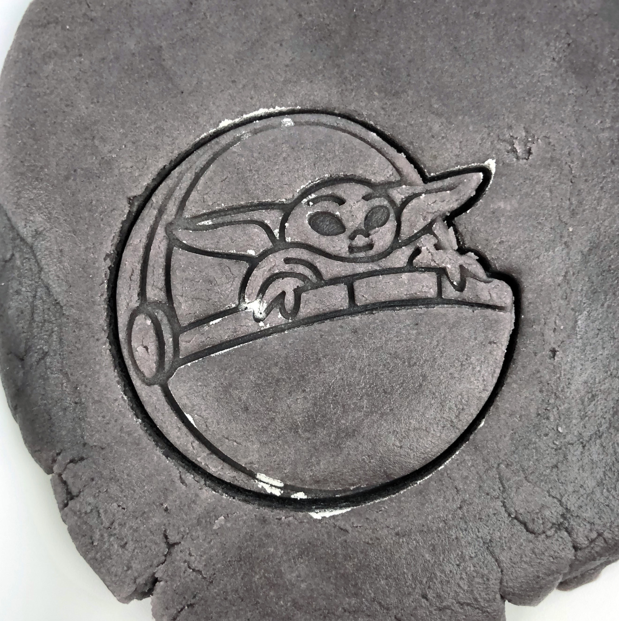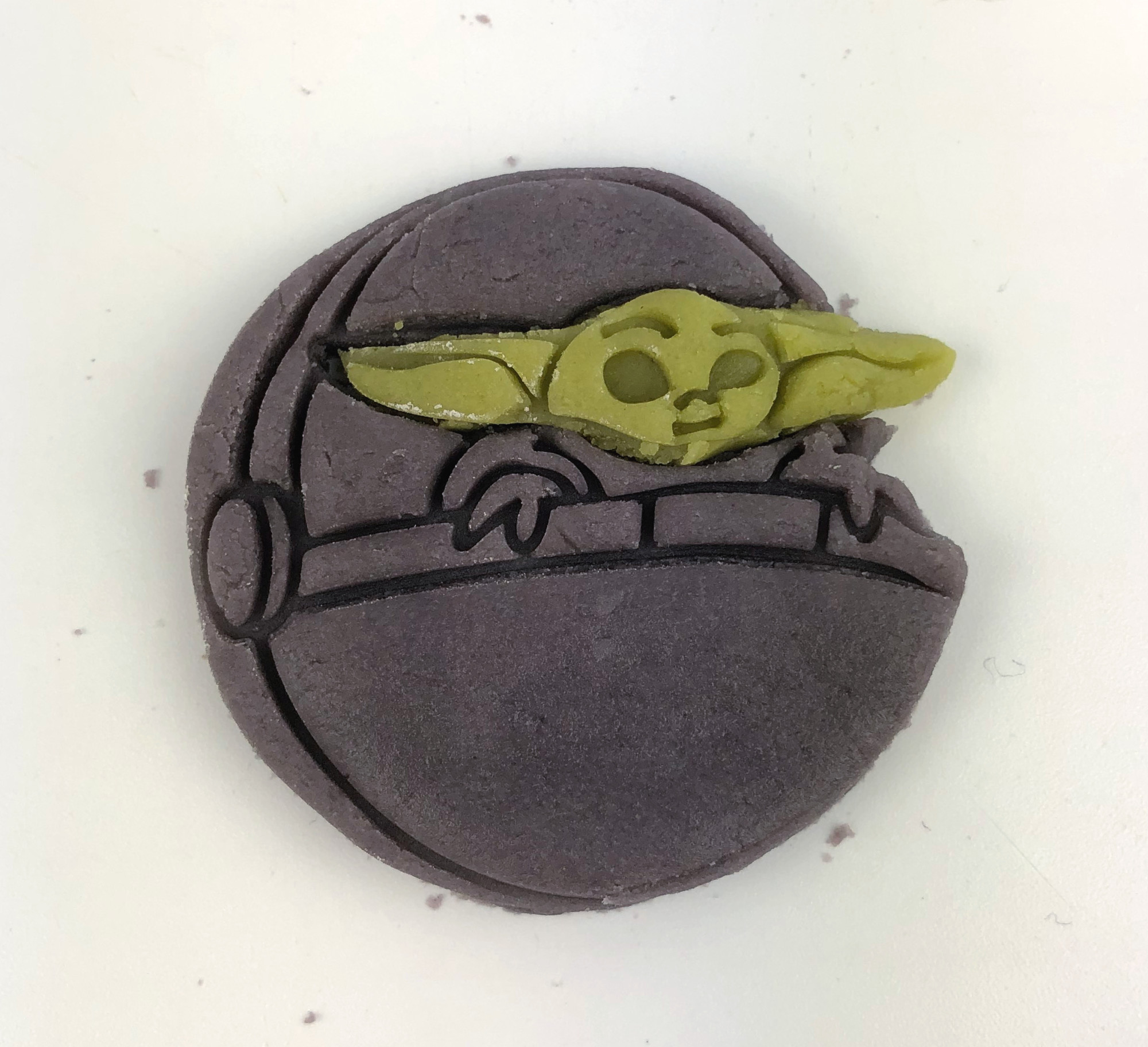 I found this adorable cookie cutter by Nimbly Merch on etsy and I was drawn to it specifically because it has Baby Yoda in his little pram. I already knew I wanted to make the pod a different colored dough from the baby himself, and this cutter was perfect for that.