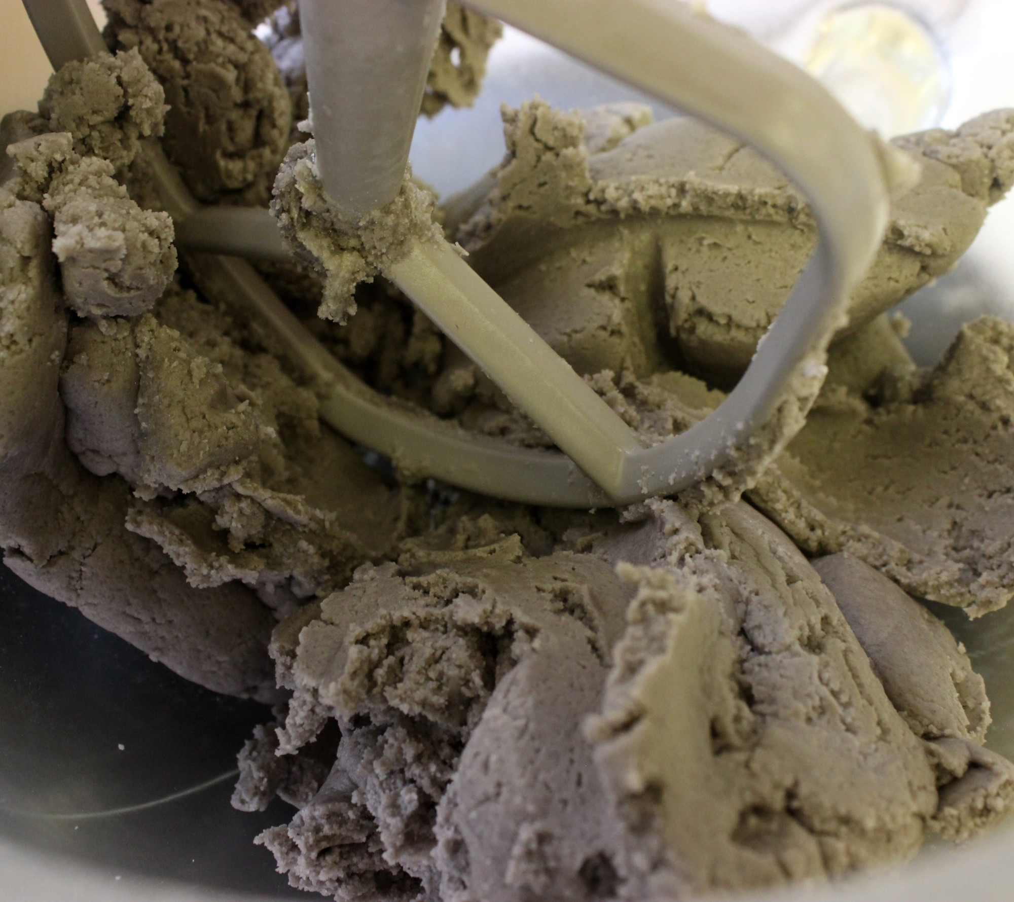 Step 4: Slowly add in the dry ingredients just until the dough comes together, and turns gray in color.