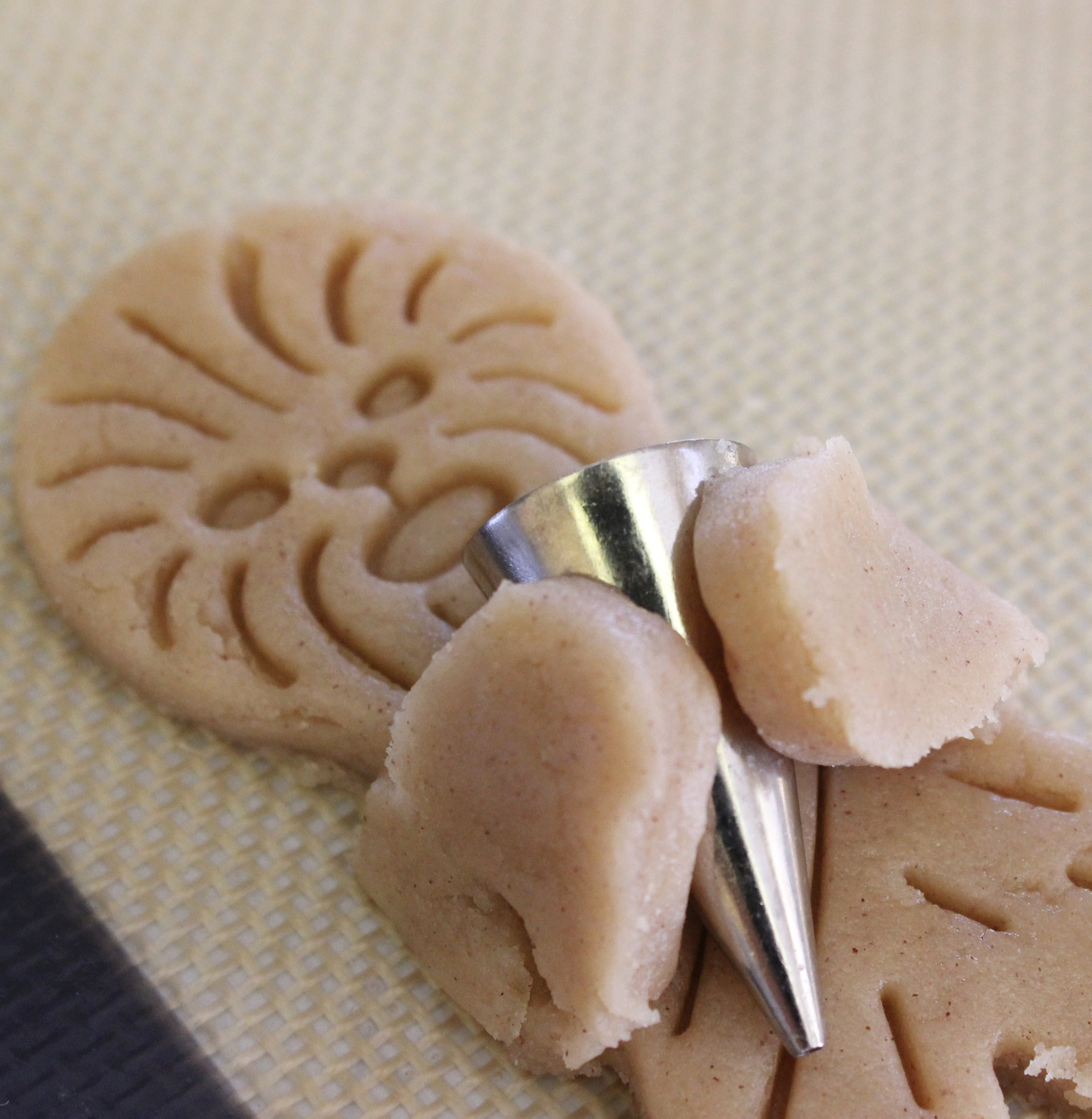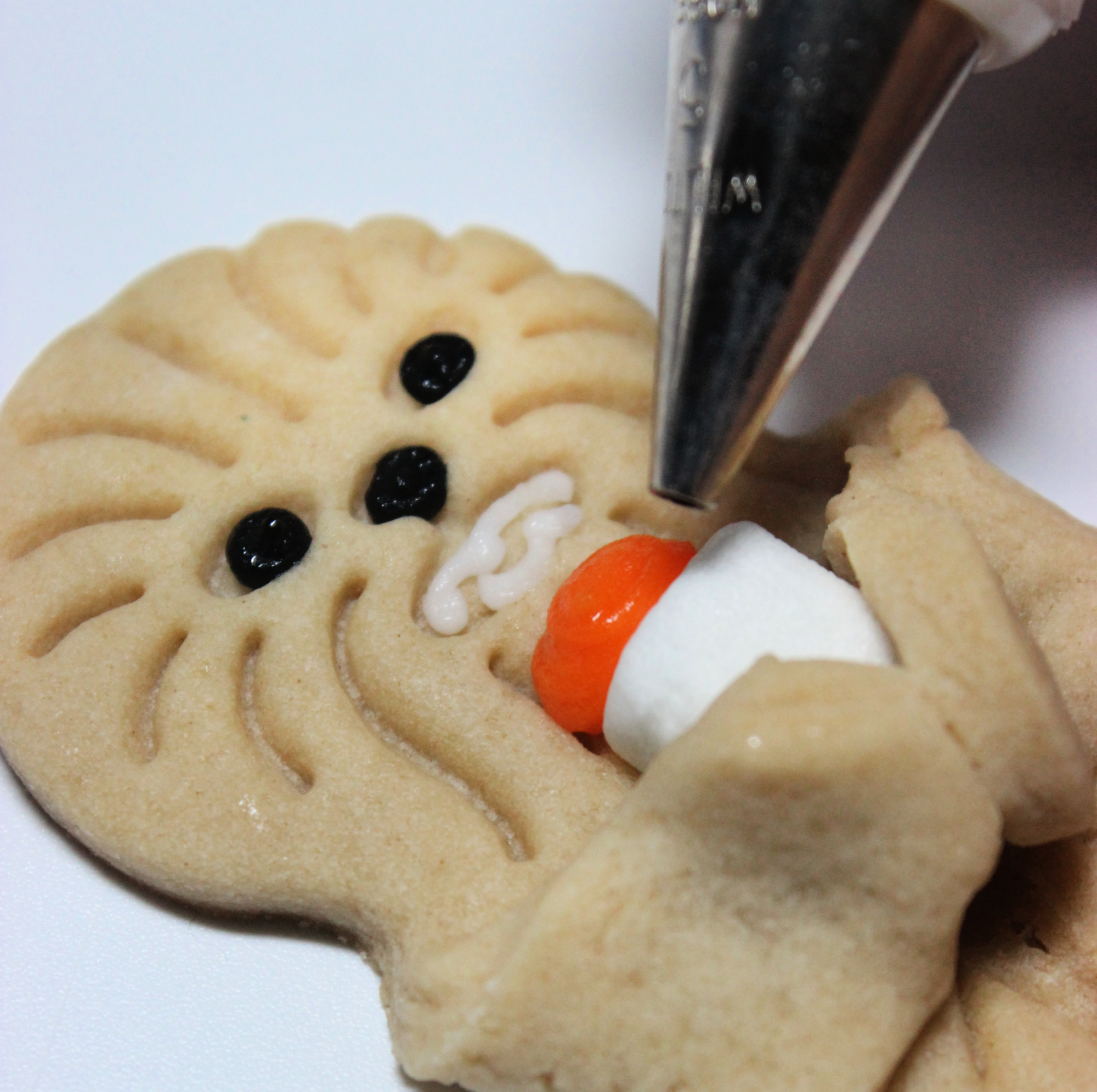 Step 7: Place a piping tip in the center of the cookie. Carefully fold the arms over to grasp the piping tip.