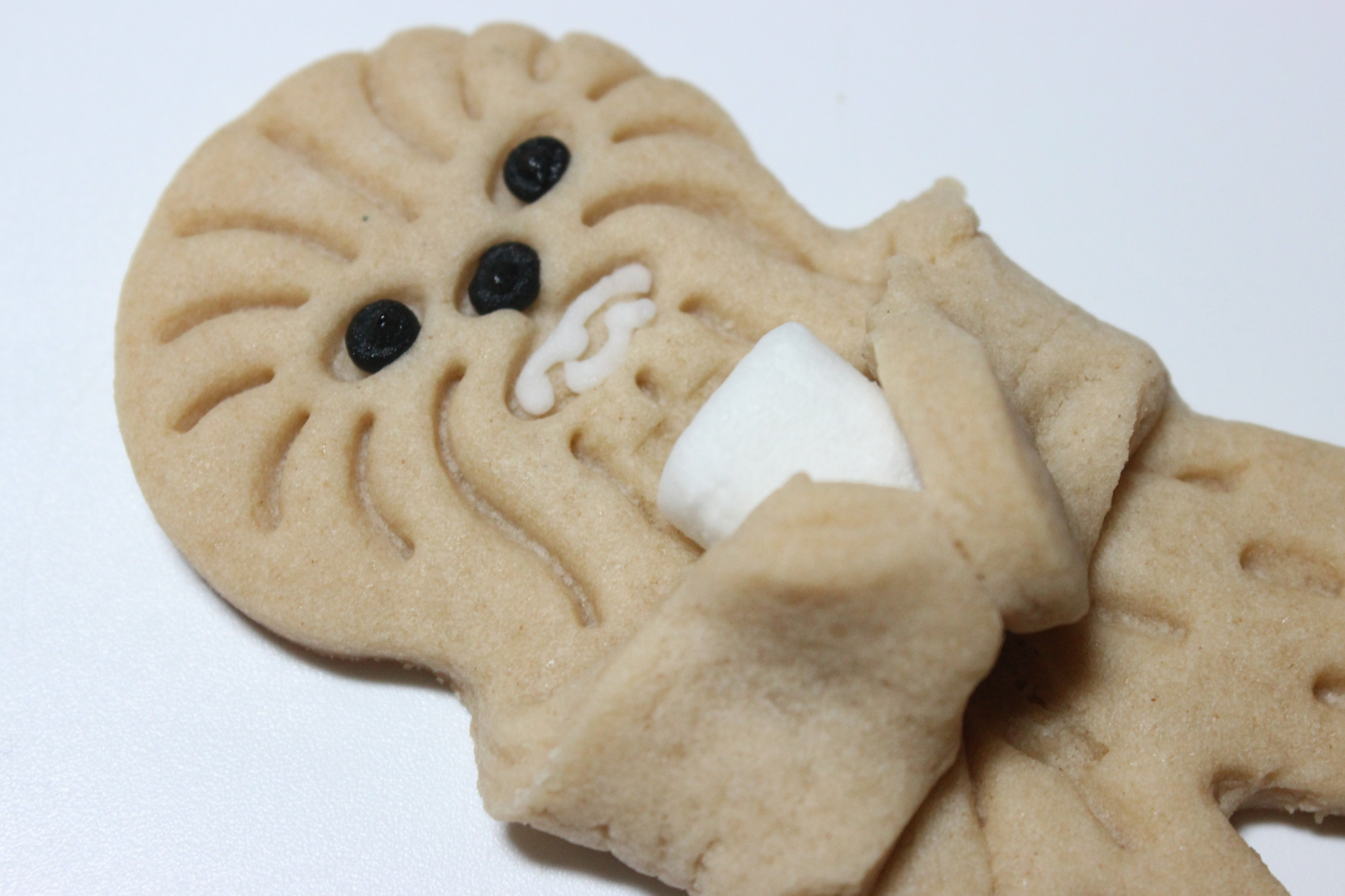 Step 9: Use a dab of icing to place the miniature marshmallow in Chewbacca’s hands.
