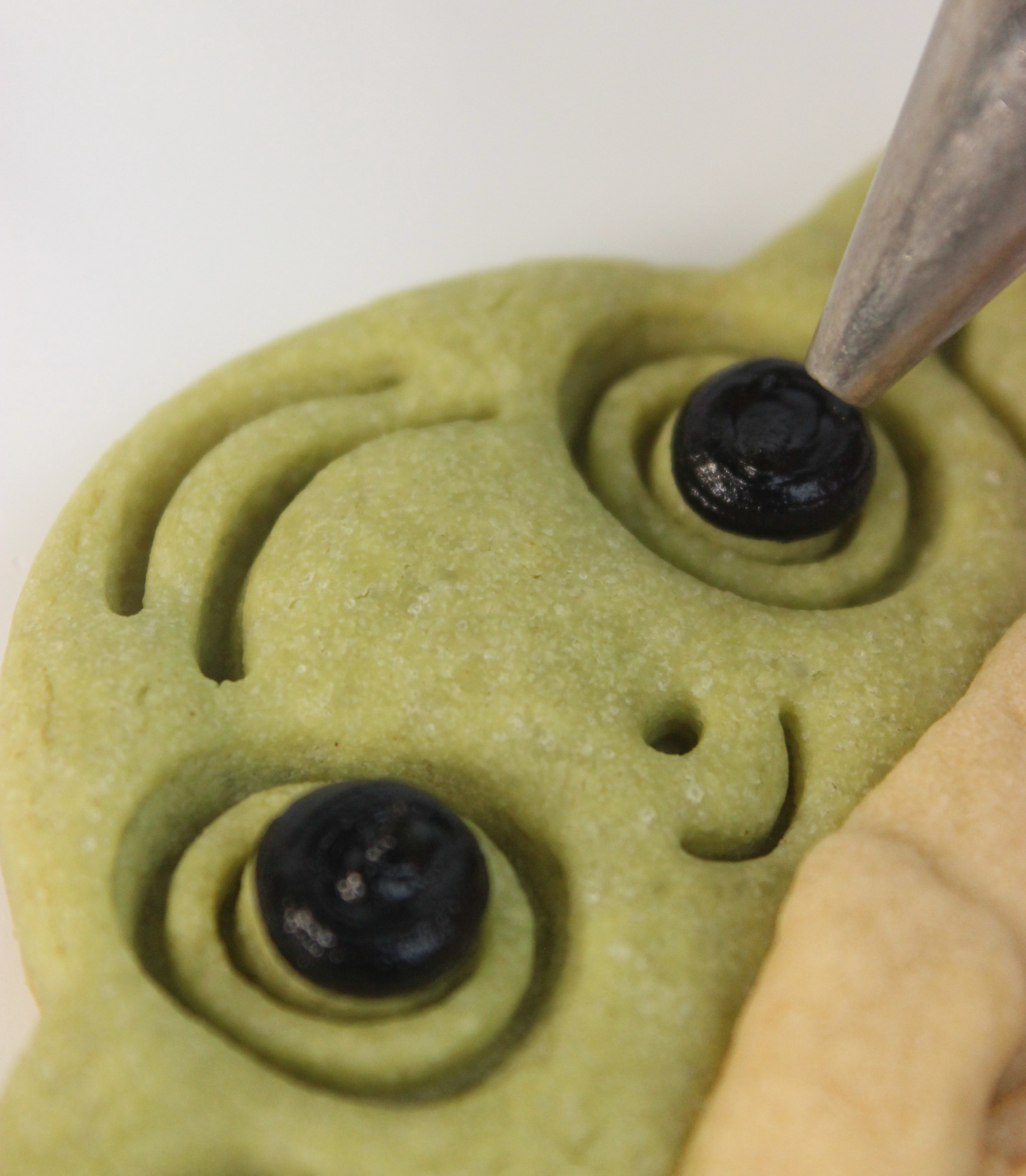 Step 18: Use the pink icing to secure the candy heart between Grogu’s hands. Once the icing is dry, the cookies are ready to serve.