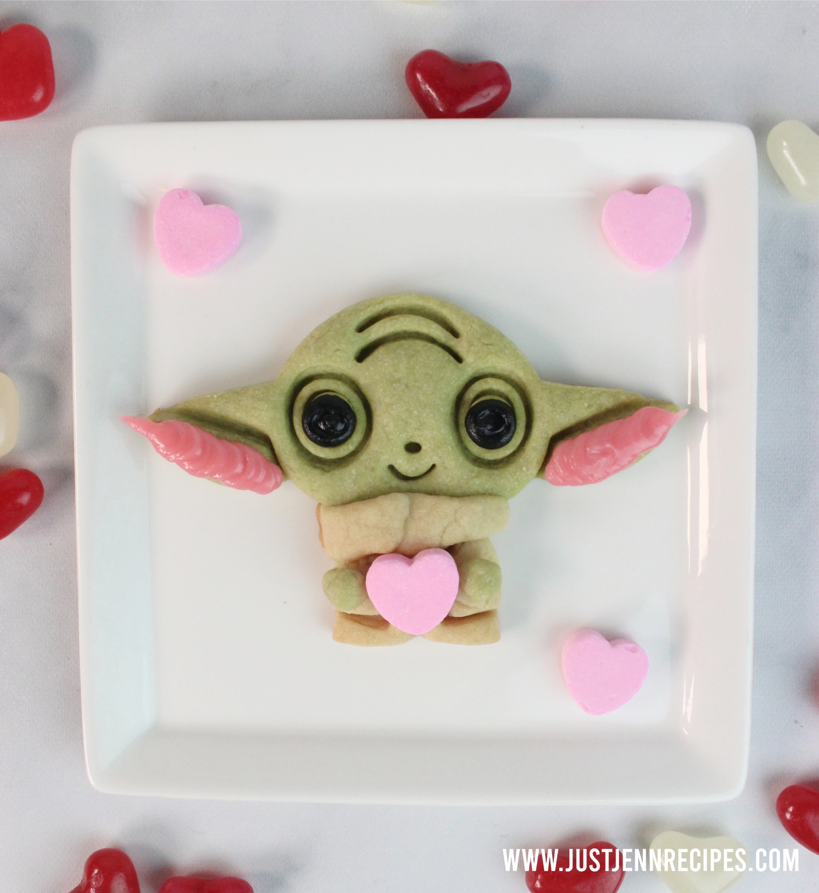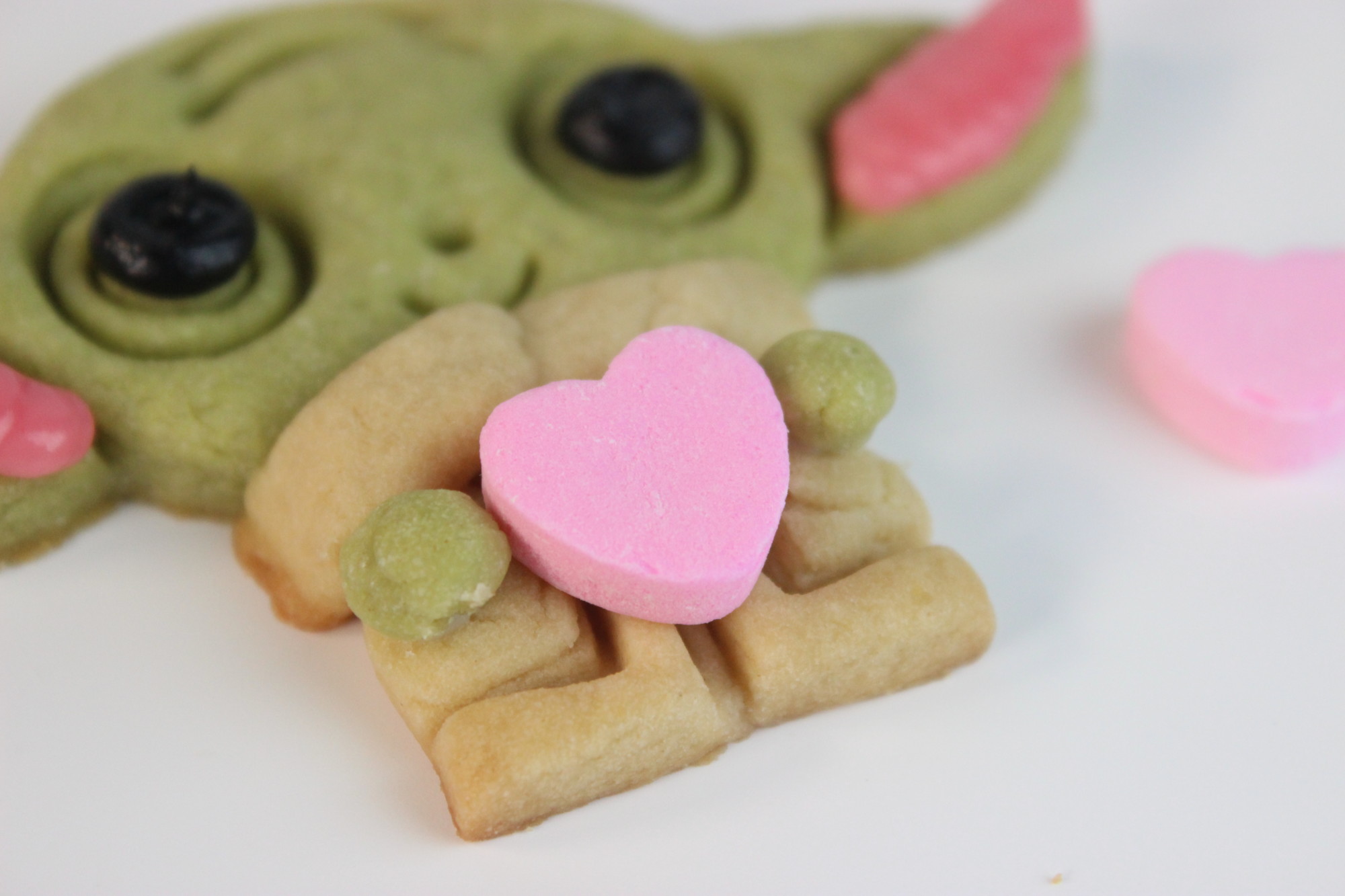These little Grogu cookies show much a little bit of love can lift your spirits. Made of matcha and brown sugar cookie doughs, he’s holding pink candy hearts for Valentine’s Day. Make these for your friends and family and help spread the love!