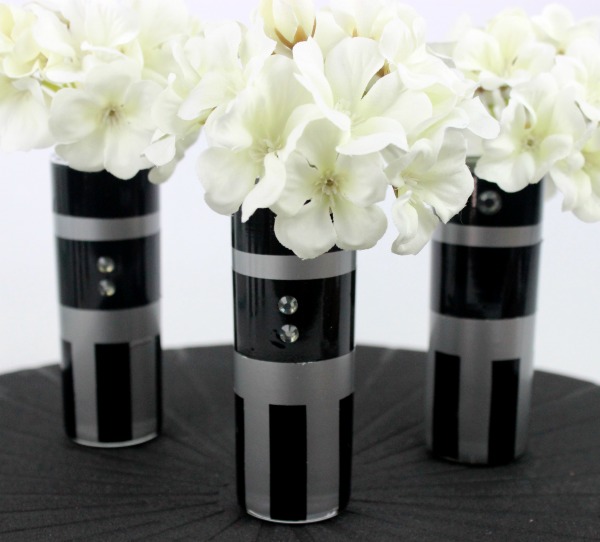 Rather than a large centerpiece, I decided to make them into individual bud vases because I wanted them to serve as favors for the guests. I definitely kept these to Darth Vader’s saber design—wedding or not—I’m always choosing the dark side.