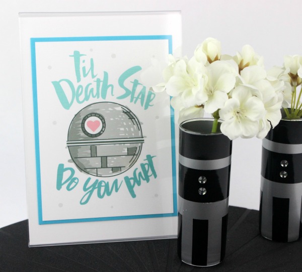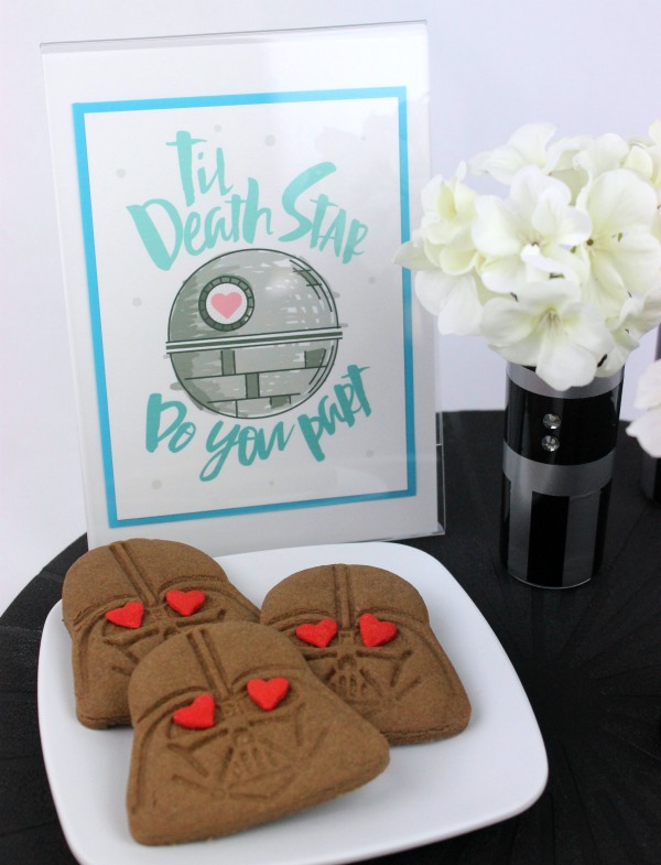 There are so many wonderful ways to celebrate the big day, but sometimes a handmade touch ends up being the most fun. I bought a Star Wars themed wedding card on etsy and framed it as a centerpiece, then I used the starwars.com Lightsaber Vase tutorial to make smaller individual bud vases for everyone at the party. No party is complete without sweets, so Vader heart-eyes-emoji cookies were in order!