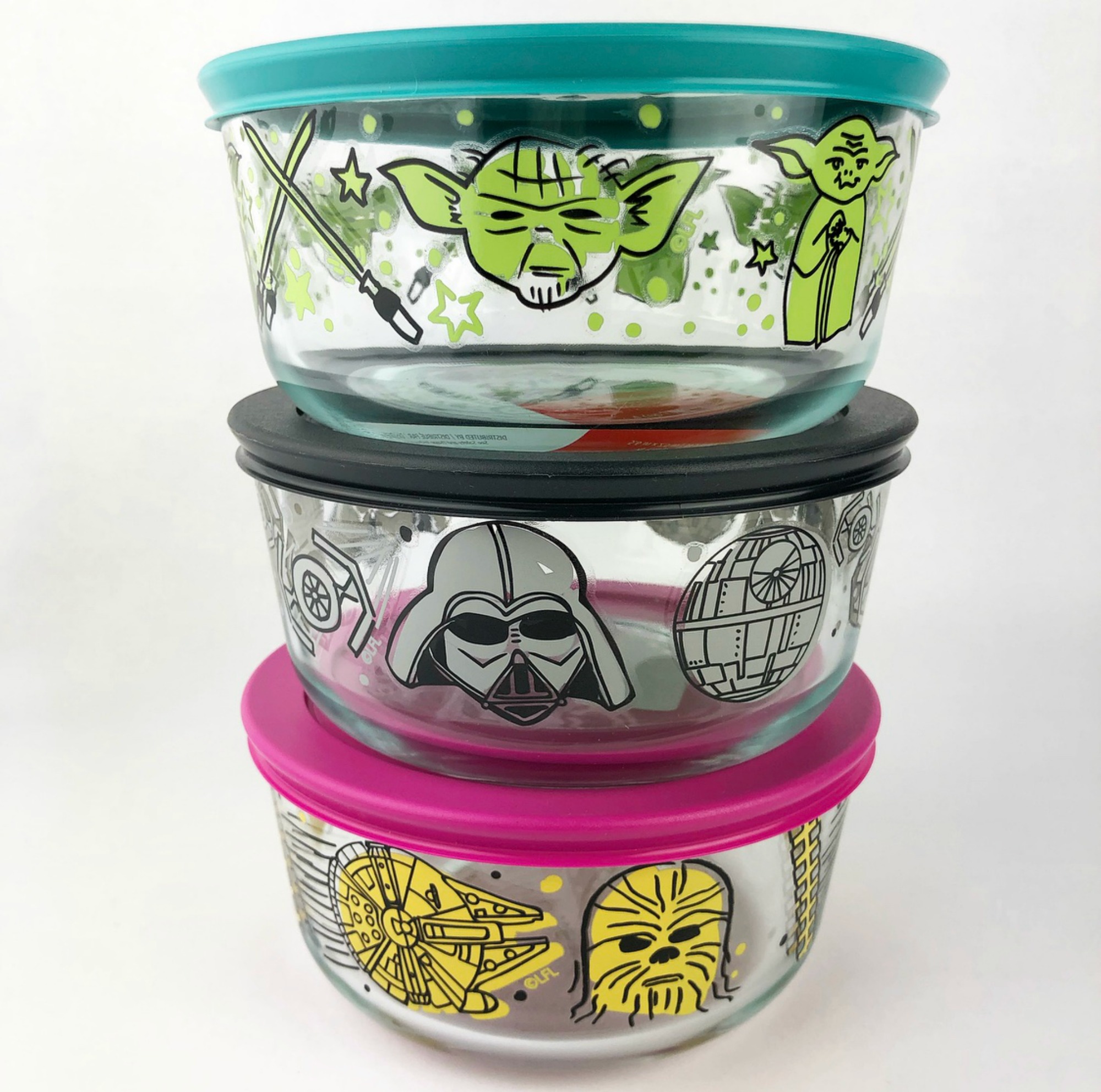 The Star Wars Pyrex storage set consists of two round 4-cup and two rectangular 3-cup containers. The round ones feature Yoda and Chewie, and the other two: R2-D2 and Darth Vader.
