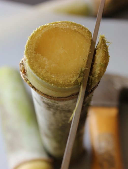 To slice sugar cane you must peel it first. You’ll need one of your lesser knives, a hammer and a whole lot of patience and cautiousness. Carefully hammer the knife down the edge of the cane to peel off the hard exterior. After you make your way around all the edges, the big payoff is the sweet interior!