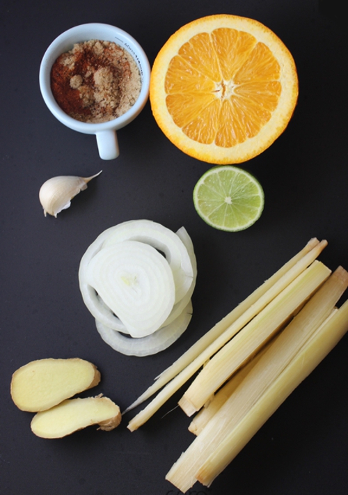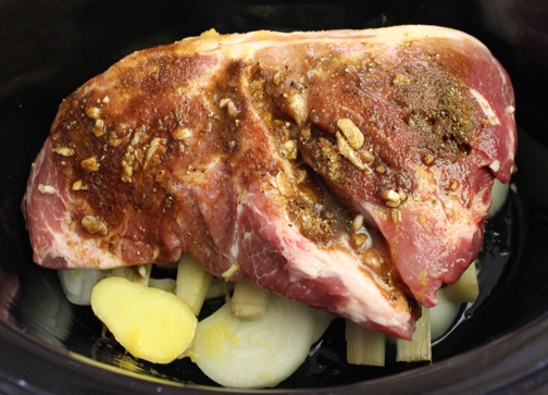 Slice the cane into sticks and pound it slightly to release the sugary juices. On the bottom of the crock pot, layer the sugar cane sticks on top of the sliced onion. Place the pork on top followed by the ginger and garlic.