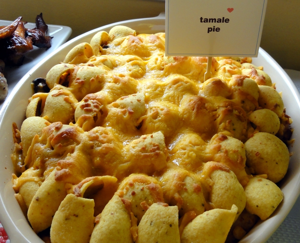 On top of the filling add a layer of corn chips. Since I was serving this for a party I used giant Fritos Scoops and layered it in a nice design. That sort of work isn’t necessary, a neat layer of corn chips works just fine. Sprinkle the cheese on top and bake for 30 minutes until the cornbread layer is cooked through. Serve hot.