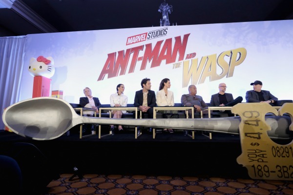 Is that…a spoon or am I tiny? Is a reasonable question when entering the press junket for Ant-Man and the Wasp. Surrounding the stage, the cast came out to props from the film including the spoon, a massive Hello Kitty Pez dispenser seen in the trailer, and a giant bread bag clip (Paul Rudd’s favorite prop). All of these items made the room feel small, but it was the cast’s enthusiasm for the upcoming film that opened up the room.