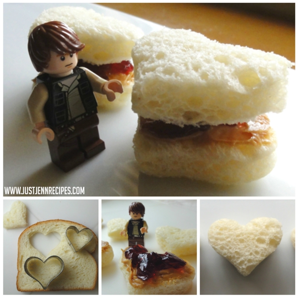 Using a small heart cookie cutter, cut out shapes from soft bread. I always like use King’s Hawaiian sweet bread. It’s nice and soft and compliments the salty peanut butter and sweet jelly.