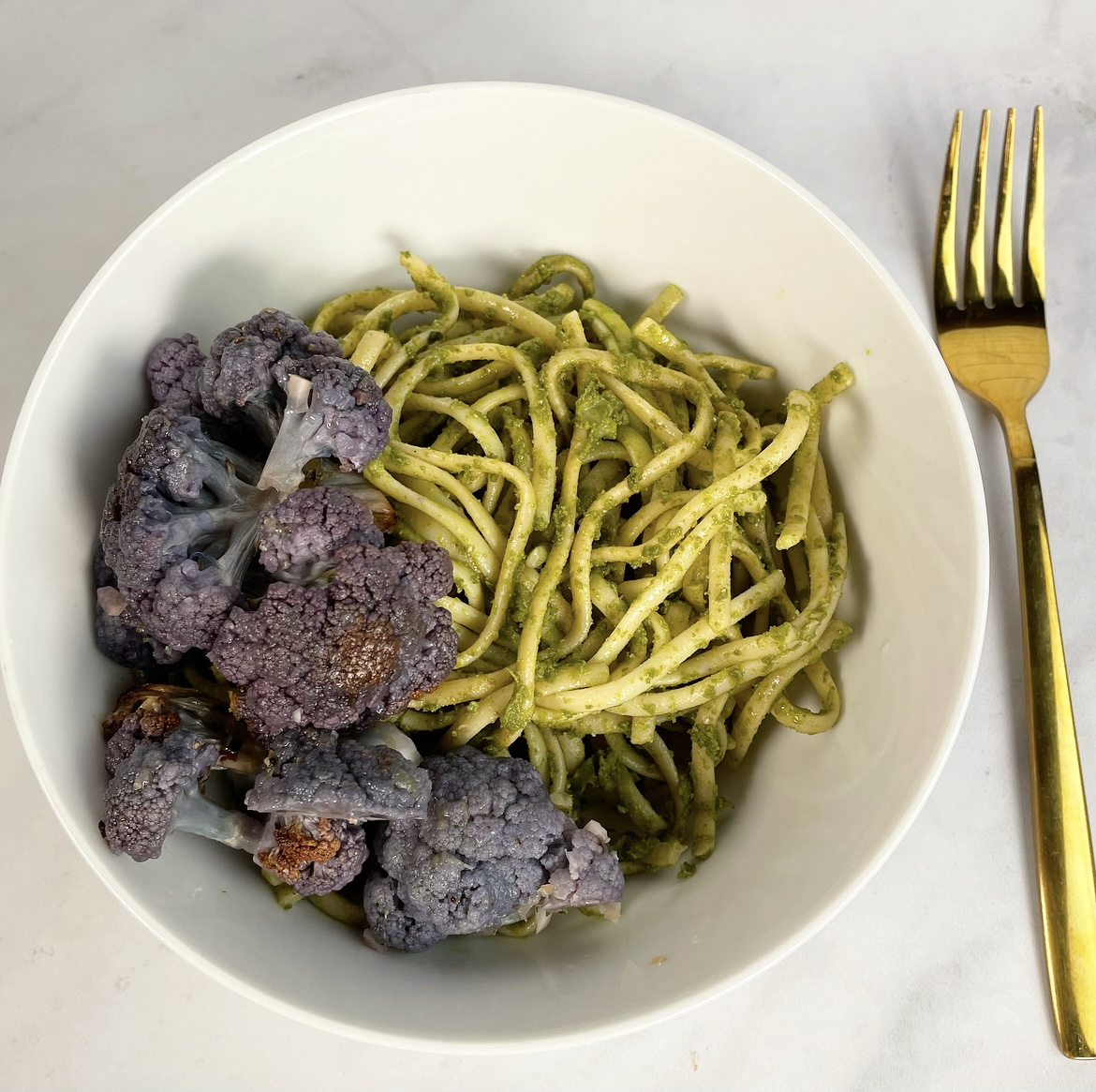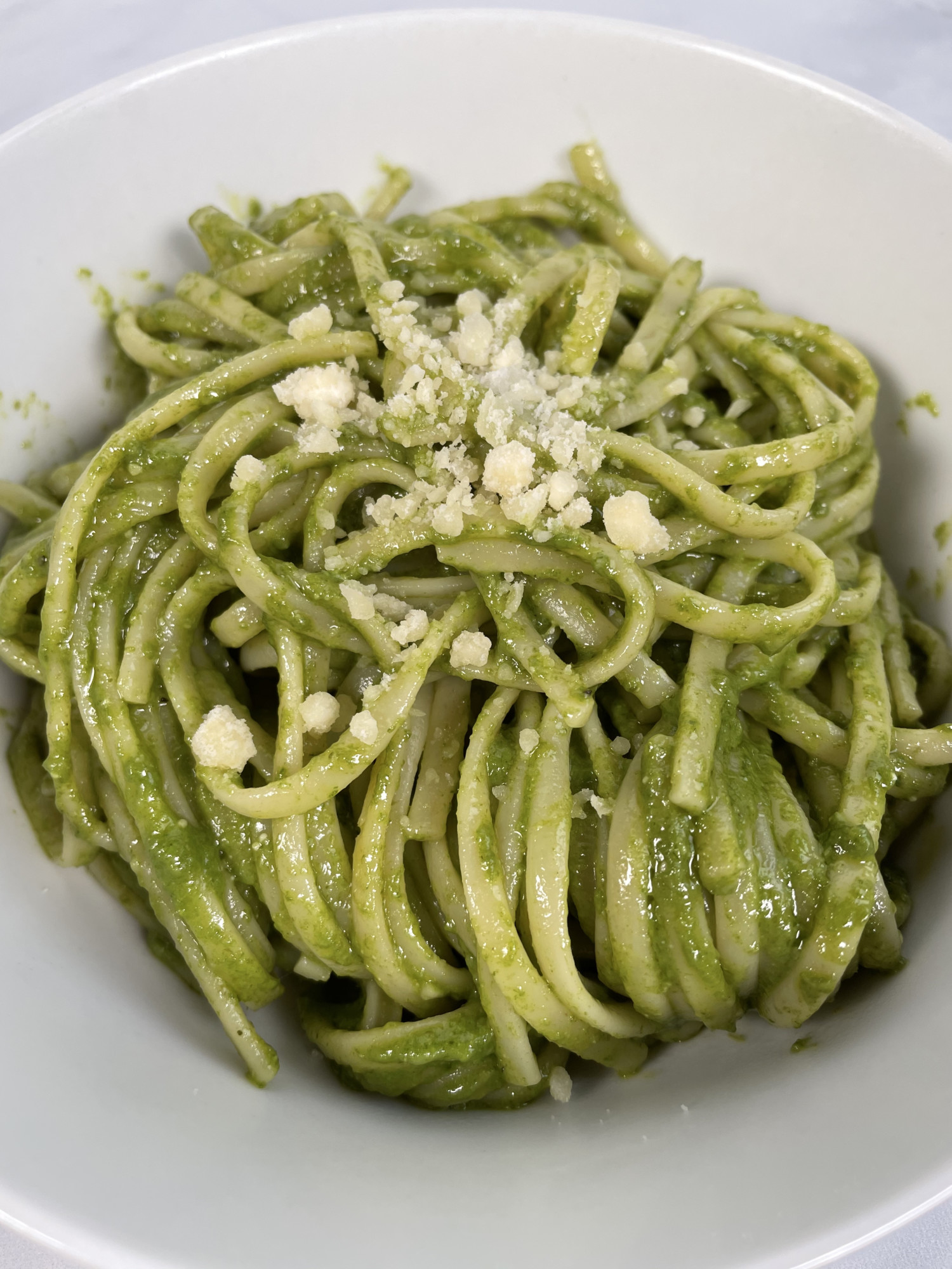 Trenette al Pesto is full of flavor and color. Sometimes I serve it with a side of colorful veggies like purple cauliflower and other times I make a side of chicken cutlets, the latter is usually at the insistence of my kids. Regardless, they also love this pasta as is. It’s warm and comforting and makes you feel good, just like a Pixar movie.