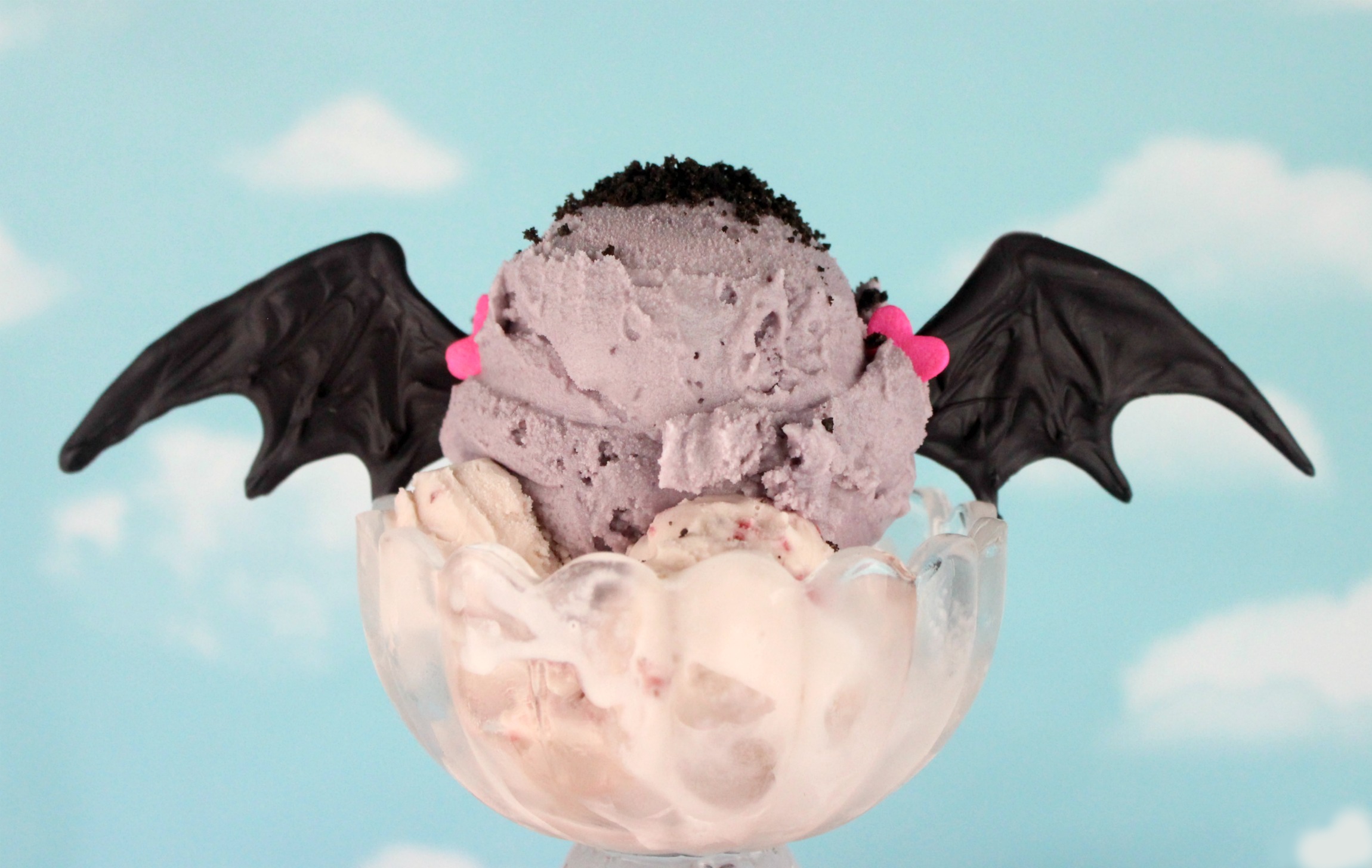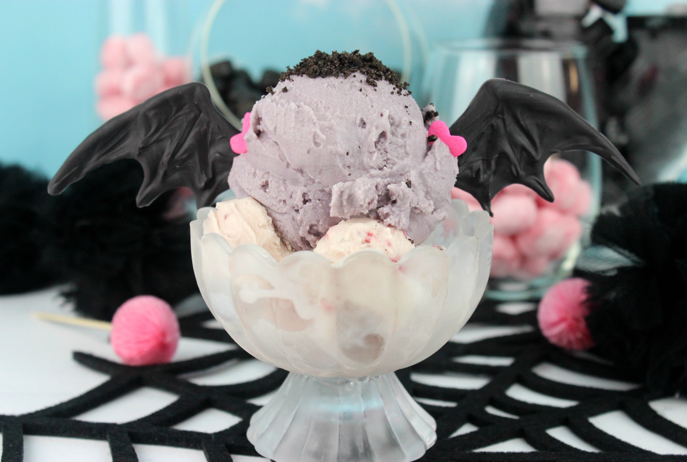 Step 5: Place the chocolate bat wings on the two sides of the ube ice cream.