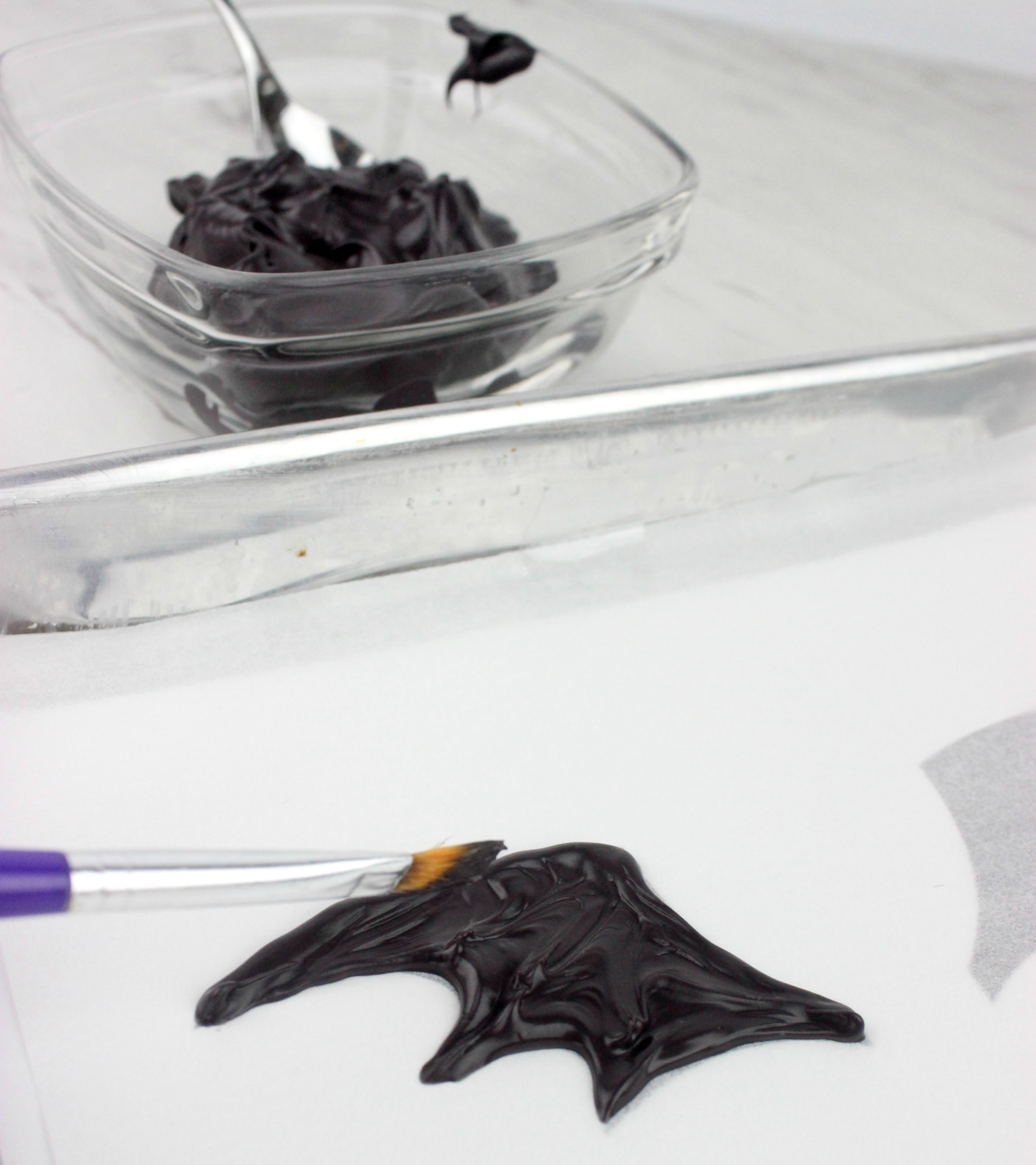 Step 2: Place a piece of parchment over the template and spoon or pipe the candy melts to create the bat wings. Place in the freezer to set.