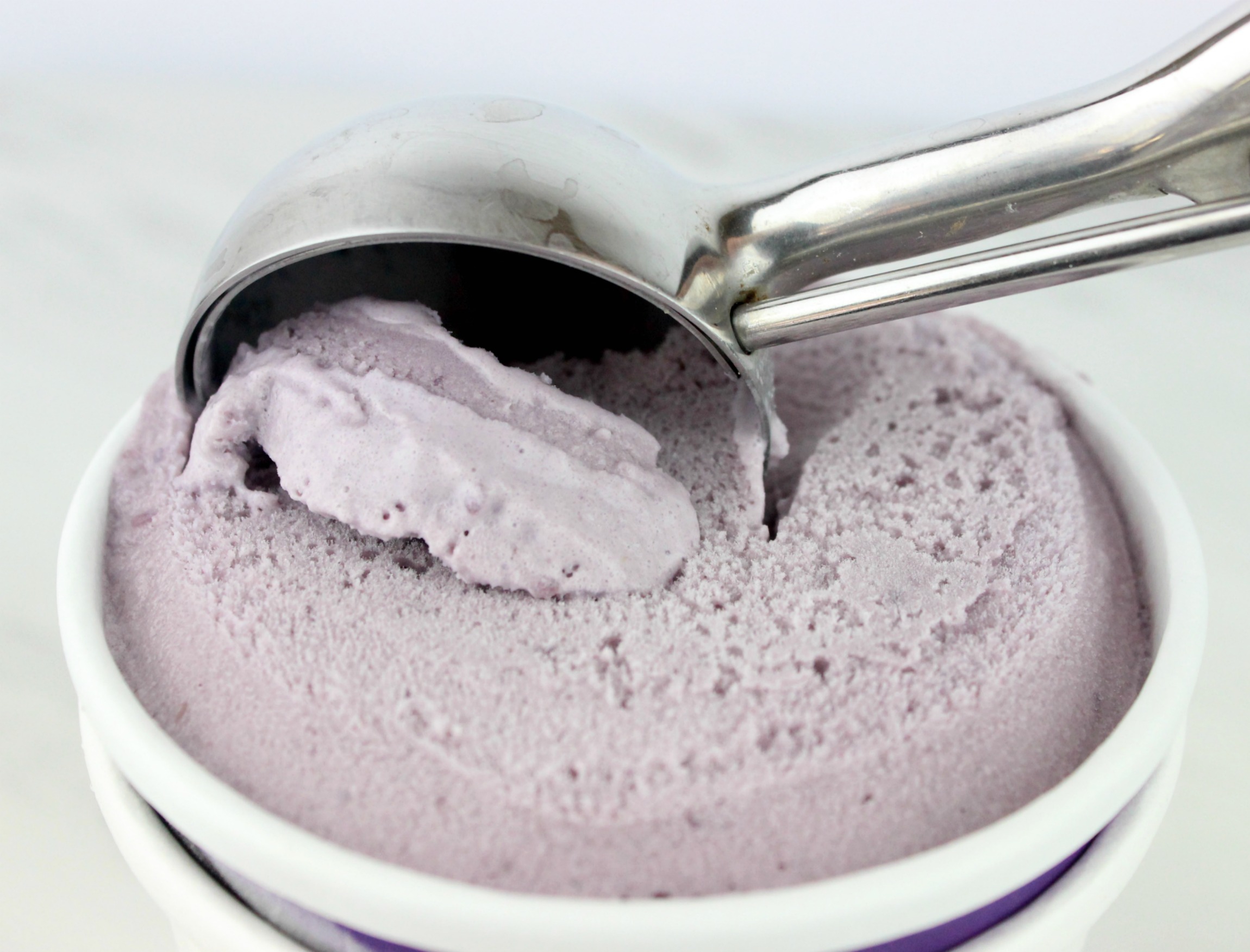 Step 4: Scoop a large scoop of ube ice cream on top of the small strawberry ice cream scoops.